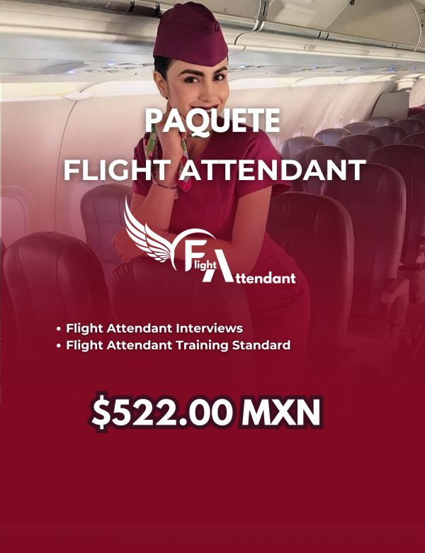 Paquete esencial para futuros tripulantes de cabina: incluye preparación para entrevistas y estándares de entrenamiento en seguridad y servicio. Ideal para quienes buscan iniciar su carrera en la aviación comercial.